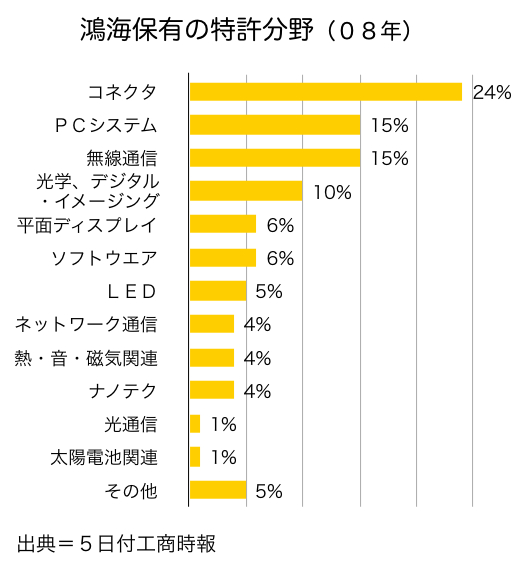 特許の内容も10年前はコネクターが全体の94%を占めたが、現在はコネクターの比率は24%に低下し、ネットワーク、精密光学、無線通信、発光ダイオード(LED)、平面ディスプレイ、ナノテク、コンピューターシステムなどに多様化した。