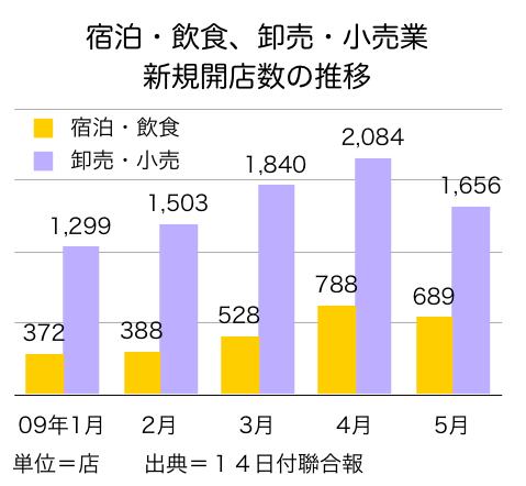 またコンビニエンスストア、衣料品店、スポーツ用品店などに加え、インターネット上での出店を含む卸売・小売業でも、昨年1カ月平均1,700~1,800店だった新規開店数は、世界金融危機の発生で一時は約1,300店まで落ち込んだものの、今年に入り▽3月、1,840店▽4月、2,088店──と急速な回復を見せている。