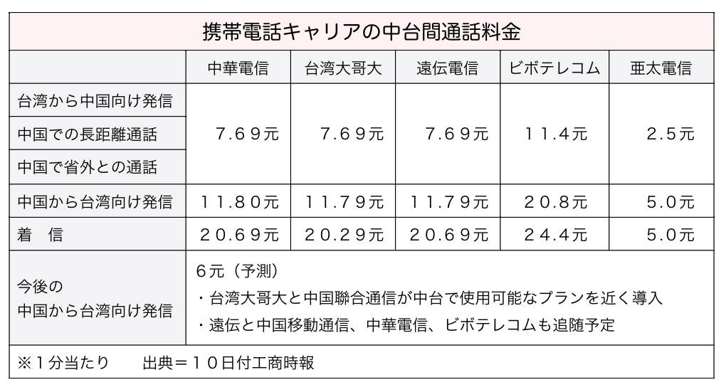 台湾大哥大(タイワン・モバイル)と中国聯合網絡通信(チャイナ・ユニコム)は9日、携帯電話番号を変えずに、1枚のSIMカードを中台双方で使用できる自動ローミングサービス「両岸一卡漫遊」プランを近く導入すると発表した。通話料金はいずれも滞在地のキャリアの料金体系に基づき課金されるため、高額なローミング通話料を支払う必要がなくなる。10日付工商時報が伝えた。