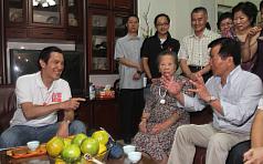 宿泊先の江春円氏(90、前右2)は馬英九総統(左)に高得票での当選を祈願したお守りを手渡した(4日=中央社)