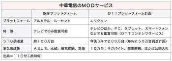 中華電信は、来年第1四半期にも導入するMODの第2世代プラットフォームでOTT型によるコンテンツ配信を行いたい意向だ。来年7月のロンドン五輪開幕までにセットトップボックス(STB)の買い替えを促す。