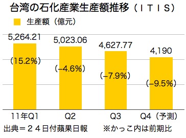 ITISによると、第3四半期の生産額は前期比8%減の4,627億7,700万元だった。世界的な景気減速、中国の金融引き締め政策、欧米の債務問題などが需要に影響したことや、台塑集団(台湾プラスチックグループ)第6ナフサ分解プラント(通称六軽)の稼働率が安全検査のため低下したことが理由と分析した。