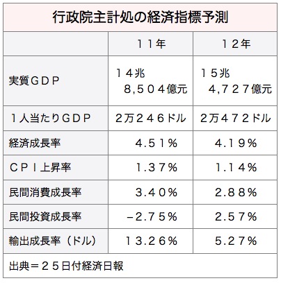 行政院主計処は24日、最新の経済予測を発表し、今年の台湾域内総生産(GDP)を、前回予測(10月末)の4.56%から4.51%に下方修正した。欧州の債務問題が市場の信頼感に深刻な打撃を与えているとの見方が背景となった。また来年の成長率についても輸出の2けた成長は難しいとの判断から、予測をこれまでの4.38%から4.19%に引き下げた。25日付工商時報が報じた。