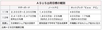 また、インテルが来年の世界市場の出荷台数を前年比17%減の2,500万台と予測するネットブックについては、ASUSは来年の全社目標を今年と同水準の480万台に定めシェア拡大を狙うが、発表は同17%減の400万台になると観測されている。