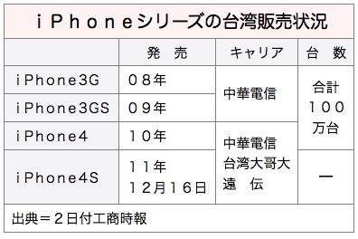 台湾でもiPhoneは、従来機種の3G、3GS、4といずれも人気を呼んでおり、販売台数は3Gと3GSが合計約30万台、4は60万台を超えたとみられる。業界ではiPhone4Sの販売台数も60万台を突破するとの見方が出ており、通信キャリアからは、発売当初は他社のハイエンド製品の売れ行きが落ちると懸念する声も上がっている。
