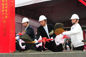 郭董事長(中央)は、馬総統(左)とともにくわ入れを行った(高雄市政府リリースより)