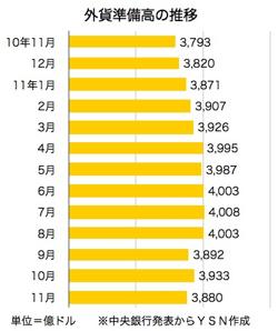 なお、台湾の外貨準備高世界ランクは変わらず4位だった。上位3位は▽中国、3兆2017億米ドル(11年9月末)▽日本、1兆1,291億米ドル(11年10月末)▽ロシア、4,640億米ドル(11年10月末)──。