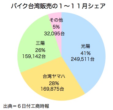 メーカー別では、▽光陽工業(KYMCO)、1万8,178台(シェア40%)▽台湾山葉機車工業(ヤマハモーター台湾)、1万2,831台(シェア28.8%)▽三陽工業(SYM)、1万688台(シェア24%)──。