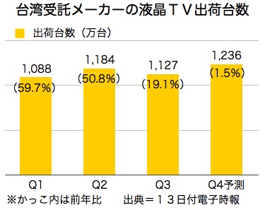 13日付電子時報が市場調査機関の予測を基に報じたところによると、台湾の液晶テレビ受託メーカーの第4四半期出荷台数は1,236万台となり、前年同期比で1.5%の伸びにとどまる見通しだ。販売業者の在庫調整で出荷台数が減った前期からは9.6%増える予測だ。
