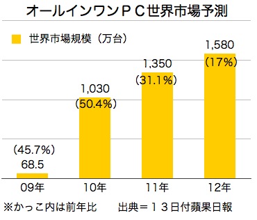 デジタイムズ・リサーチによると、オールインワンPCの世界市場予測は、今年が前年比31%増の1,350万台、来年は今年比17%増の1,580万台。