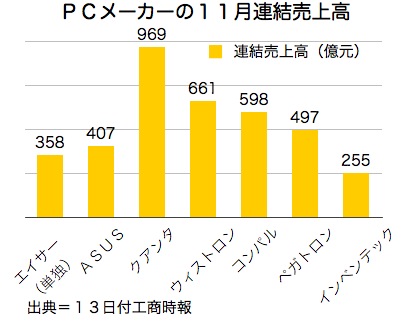 また、ノートPC受託生産大手、仁宝電脳工業(コンパル・エレクトロニクス)の11月連結売上高は前月比0.5%増の597億8,000万元で、こちらも予測を上回った。ノートPC出荷台数は前月比20万~30万台減の290万~300万台だったものの、聯想(レノボ)やエイサーからの受注増加やハイエンド機種の出荷比率上昇が増収につながった。1~11月の累計売上高は前年同期比22.3%減の6,395億1,000万元となった。