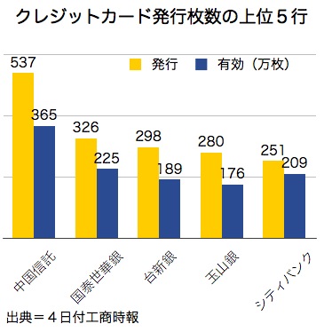 また、1~11月の流通枚数は10年末時点より207万枚、有効カード数も106万枚増加したが、リボルビング払い利用の残高は1,413億元で10年末より397億元減少した。支払期限前の分割払い未払い残高は約650億元となっている。