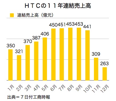 昨年第4四半期の連結売上高予測を11月末に下方修正したHTCは、12月の連結売上高が前月比15%減の263億元にとどまり、2010年8月以来最低となった。ライバルのサムスンによる大幅値下げやアップルのスマートフォン新製品「iPhone4S」の販売好調などが響いた。