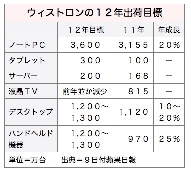 業界予測では今年、アンドロイドOS(基本ソフト)搭載タブレット型PCの市場規模は1,500万~2,000万台。ウィストロンが実際に300万台出荷できればシェアは15~20%に達し、アップルを除く同製品の受託製造量では首位となる。