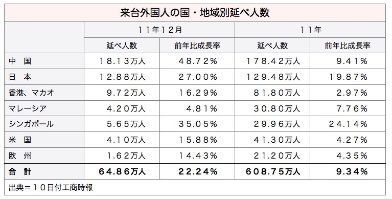 交通部観光局の9日発表によると、2011年の訪台観光客数は前年比9.34%増の延べ608万7,500人で過去最高を更新。成長率は世界観光機関(UNWTO)が予測した11年世界全体の外国旅行者数4~4.5%増の2倍以上を記録した。市場規模は3,000億台湾元(約7,680億円)に上ったとみられる。10日付工商時報が報じた。