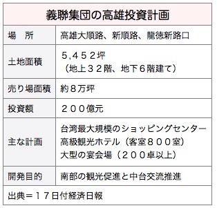 民間の鉄鋼最大手で、大型複合商業施設なども手がける義聯集団(Eユナイテッド・グループ)の林義守董事長は16日、200億台湾元(約535億円)を投じて高雄市中心部に台湾最大規模のブランド品ショッピングセンター(SC)と5つ星ホテルを建設すると発表した。17日付経済日報が伝えた。