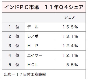 市場調査機関ガートナーのインドパソコン市場に関する報告によると、昨年第4四半期、宏碁(エイサー)のシェアは12.1%で、3位ヒューレット・パッカード(HP)を0.3ポイント下回る4位だった。1位はデルで15.5%、2位は聯想集団(レノボ)で13.1%、5位は印HCLで5.5%だった。17日付工商時報が報じた。