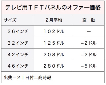 2〜3月のパネル価格は、シャープや友達光電(AUO)が生産ライン稼働率を抑えていること、中国メーカーの良品率が低いことから需給バランスは均衡しており、小幅な下落にとどまるが、第2四半期はシャープが減産の継続を決めておらず、中国メーカーの生産能力もさらに高まることから下落幅が拡大する可能性がある。