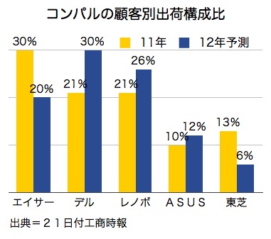 コンパルは、ASUSの超薄型軽量ウルトラブック「ZENBOOK」で、インテルの次世代プロセッサ「Ivy Bridge」搭載の次期製品を受注したとされ、4月の出荷が見込まれている。これまで「ZENBOOK」を受託生産してきた和碩聯合科技(ペガトロン)に代わる形だ。背景には米アップルが「ZENBOOK」は「Mac Book Air」に酷似しているとペガトロンに懸念を表明し、iPhoneやiPadなどアップル製品の受注を維持したいペガトロンが「ZENBOOK」の受託打ち切りを決めたことがあるとされる。