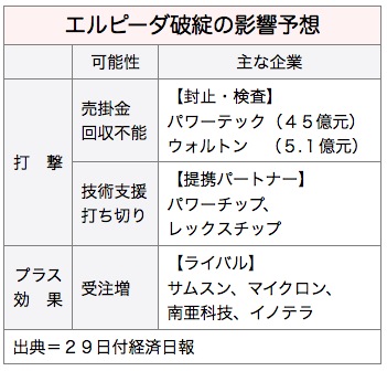 力晶科技(パワーチップ・テクノロジー)は、エルピーダの財務危機から、昨年末以降は同社に出荷しておらず、売掛金はないと説明した。華邦電子(ウインボンド・エレクトロニクス)も売掛金はないと表明した。