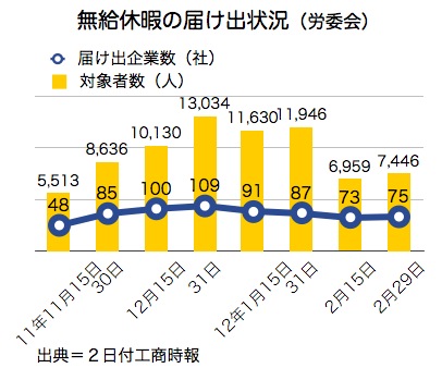 行政院労工委員会(労委会)の統計によると、無給休暇の実施を届け出ている企業は2月末時点で75社、対象となる労働者数は7,446人で、実際に同措置を適用されている人数は7,391人となり、前月より企業数は2社、適用人数は487人増加した。4割減少した15日時点から一転、増加に転じた。2日付工商時報が報じた。