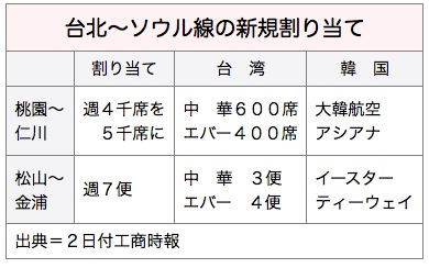 決定では松山~金浦は乗客定員200人以下の小型機となる。同時に、桃園~仁川では中華航空が座席数を週600席、エバー航空が週400席それぞれ増やせることになった。