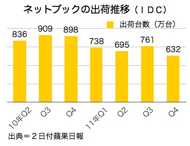 市場調査機関IDCの統計によると、ネットブックの2011年市場規模は2,826万台で前年比2割以上縮小した。今年はインテルが2,500万台以上と予測しているが、ノートPCメーカーは多くても2,000万台と悲観的だ。同製品はデルが昨年撤退を宣言したのに続き、聯想集団(レノボ)も近く販売を打ち切るようだ。サムスン電子も年内に撤退するとの観測が出ている。