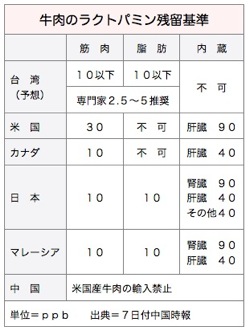 行政院が成長促進剤「ラクトパミン」(通称、痩肉精)添加飼料で飼育した牛肉の輸入を解禁する方針を固めたことを受け、行政院衛生署は3カ月以内に食品安全諮詢委員会で残留基準を決定する方針だ。残留基準は10ppb(10億分の1を示す単位)を超えないレベルで設定されるとみられる。7日付中国時報が伝えた。
