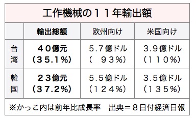税関の輸出統計によると、2011年の台湾の工作機械輸出額は40億50万米ドルで、世界4位だ。今年はイタリアを抜いて3位に立つと見込まれる。一方の韓国は昨年6位だったが急成長を見せており、今後は4位まで順位を上げるとみられている。
