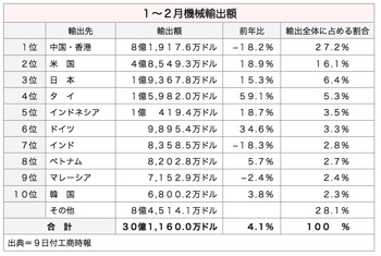 仕向け先国別の1~2月輸出額は、中国(香港含む)が8億1,917万米ドルで最大となった。ただ、年成長率は18.2%減少、機械輸出額全体に占める割合は27.2%と、初めて30%を下回った。