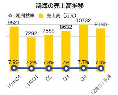 鴻海精密工業の2月非連結売上高は前月比13.87%減、前年同月比54.73%増の2,365億5,100万台湾元(約6,600億円)だった。前月比減収は、新「iPad」発売前で「iPad2」の購買意欲が低迷し、出荷が抑えられたためだ。10日付工商時報が報じた。