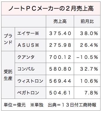 エイサーが12日発表した2月売上高は375億4,000万台湾元(約1,050億円)で、前月比38.9%の大幅増収となった。エイサーの受託生産の主力、仁宝電脳工業(コンパル・エレクトロニクス)も前月比32.7%増の580億7,900万元で、同業他社を上回る成長率だった。