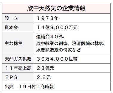 欣中は台中市の一般家庭約30万世帯に天然ガスを供給しており、昨年の売上高は23億台湾元(約65億円)だった。
