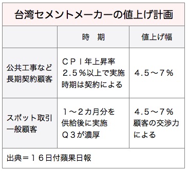 16日付蘋果日報によると、工業用電気料金が5月15日に値上げされることが確定したことを受け、セメント2大手の台湾水泥(台湾セメント、台泥)と亜洲水泥(アジアセメント、亜泥)はともに、「生産コストの上昇幅が自社で吸収できる範囲を超え、値上げは避けられない」と表明した。両社は値上げ時期や値上げ幅は明らかにしていないものの、市場関係者は、早ければ今期末にも台湾市場向けセメントで現在の1トン当たり2,200~2,300台湾元から2,300~2,450元(約6,300〜6,700円)へ、約4.5~7%の値上げが行われると予測している。