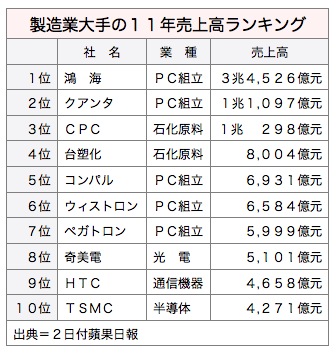 なお11年純利益ランキングは、▽1位・台湾積体電路製造(TSMC)、1,342億元▽2位・鴻海、815億元▽3位・宏達国際電子(HTC)、619億元──だった。