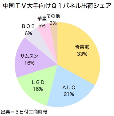 市場調査会社、ウィッツビュー・テクノロジーおよび中国調研合作機構群智諮詢のレポートによると、今年第1四半期の中国テレビ大手6社向け大型液晶パネルの出荷は、首位が奇美電子(チーメイ・イノルックス)でシェア33.3%、2位が友達光電(AUO)の21.3%で、全体の過半を占めた。奇美電は中国顧客からのさらなる受注増を図っており、新サイズパネルの39インチと50インチ製品が好調で出荷枚数を伸ばした。3日付工商時報が報じた。