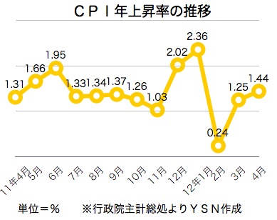 一方、同時に発表された4月の卸売物価指数(WPI)は112.94ポイントで、前月比0.03%下落、前年同月比では0.55%の下落で、2カ月連続でマイナス成長だった。