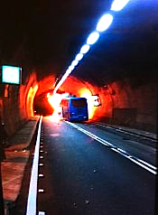 トンネル内のモニター映像からは、高速バスの前面が炎に包まれるのが確認できた(7日=中央社)
