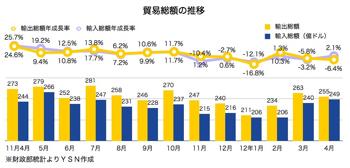 財政部が7日発表した4月輸出総額は前年同月比6.4%減で前月に続きマイナス、1~4月累計でも前年同期比4.7%減に陥った。中でもスマートフォンなど情報・通信製品の前年同期比16.1%減が目立った。財政部は、上半期通期でも輸出総額がマイナス成長となる可能性が高いと予測。長期にわたって製品、マーケットが偏り過ぎていることが原因で、台湾の輸出競争力が低下していると警戒感を示した。8日付経済日報などが報じた。