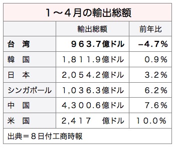 1~4月の輸出総額は963億7,000万米ドル。情報・通信製品の前年同期比16.1%減(輸出総額50億米ドル)を筆頭に、化学品11.4%減(73億米ドル)、光学器材9.4%減(67億2,000万米ドル)、紡織品6.4%減(40億5,000万米ドル)など上位10製品項目のうち8項目がマイナス成長だった。