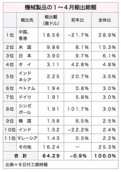 仕向け先別の1~4月は輸出額は、中国・香港が前年同期比2割減となったものの首位。2位は米国で同8.1%増の9億8,600万米ドル、3位は日本で同9.7%増の3億9,000万米ドルだった。