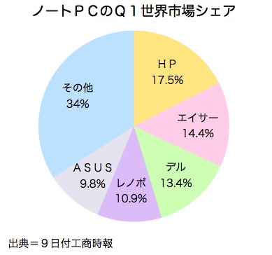 ノートPC市場の出荷台数シェアは上位から順に、▽ヒューレット・パッカード(HP)、17.5%▽エイサー、14.4%▽レノボ、13.4%▽デル、10.9%▽華碩電脳(ASUS)、9.8%──。首位HPの今年第1四半期の出荷台数は892万8,000台だった。