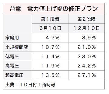 また当初プランで全面的に平均30%の値上げとしていた小規模商店の電力料金は、月間使用量が330キロワット時(kWh)以下の場合は値上げ対象から除外され、平均上げ幅は第1段階で10.7%、2段階合計で21%となる。