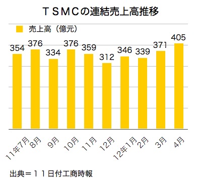 ファウンドリー最大手、台湾積体電路製造(TSMC)が10日発表した4月連結売上高は、前月比9.2%増、前年同月比9.1%増の404億9,600万台湾元(約1,100億円)で、過去最高だった。製造プロセス28ナノメートルの需要増で、5~6月も月400億元を超えるとみられる。11日付経済日報が伝えた。