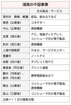 郭董事長はまた、日本がモノづくりを手放すことはなく、鴻海と提携して中国で作れば成功すると述べた。過去2カ月間に6回訪日し、合計1カ月の滞在中に、日本企業100社以上が提携を持ちかけてきたという。一方で、鴻海が10%出資し筆頭株主となるシャープに関し、出資比率をもっと引き上げたいが同意が得られていないと漏らした。