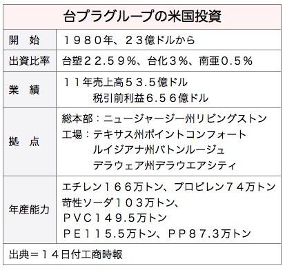 台塑集団(台湾プラスチックグループ)は石油化学産業にとって台湾域内の投資環境が悪化しているとみて、米国での投資を拡大するもようだ。台プラグループ傘下、台湾塑膠工業(フォルモサ・プラスチックス)の李志村董事長はこのほど、工商時報の取材に対し、米国の原料コストの低さおよび現地政府の支援体制を好感し、テキサス工場への投資上限を20億米ドルに引き上げたことを明らかにした。同工場の拡張が完了すれば、同グループの米国における年産能力はエチレンが246万トン、プロピレンが134万トンに拡大する。14日付同紙が報じた。