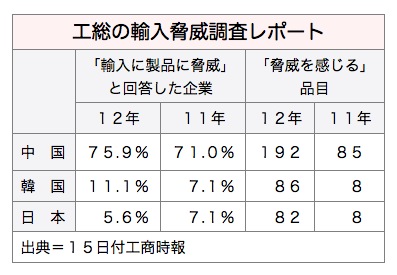 このほど中華民国全国工業総会(工総)が地場メーカーに対して行ったアンケートをまとめた「2012年輸入脅威調査報告」によると、「輸入製品に脅威を受けている」との回答が7割に上った。脅威を感じる輸入製品の品目は計198品目で昨年(91品目)に比べ2倍以上に増え、国別に見た場合、中国が192品目と最多で、韓国の86品目、日本の82品目が続いた。15日付工商時報が伝えた。