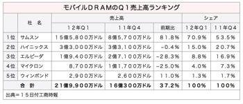 各社のシェアは、サムスン電子(70.9%)を筆頭に、SKハイニックス(15.0%)、エルピーダメモリ(8.8%)、マイクロン・テクノロジー(4.0%)、ウィンボンドの順だった。