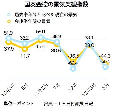 国泰金融控股が15日発表した5月の「国民経済信心(信頼感)調査」によると、今後半年の景気見通しである「景気楽観指数」が過去最低のマイナス44.3ポイントを記録するなど、2010年3月の調査開始以来、最も悲観的な結果となった。調査期間である5月1~7日に電力料金の段階的な値上げや、証券取引所得税(キャピタルゲイン課税)の導入方針が決定したことなどが影響したとみられる。16日付蘋果日報などが報じた。