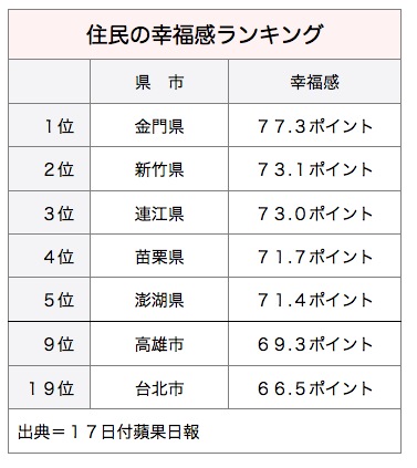 同ランキングではこのほか、3位に馬祖島の連江県(73.0ポイント)、5位に澎湖県(71.4ポイント)と、離島の県が上位に入ったのが目立った。台北市は66.5ポイントで19位。最下位は新北市の62.6ポイントだった。